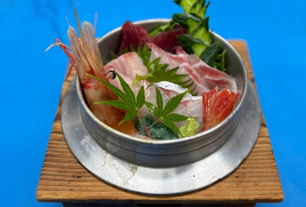 旬の魚の漬けとお刺身の丼ぶり・漬物・あら汁